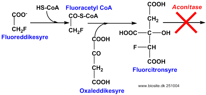 Aconitase er et enzym i TCA-cyclen. Det aktive site på enzymet indeholder et Fe2+ atom. Enzymet hæmmes af fluorcitronsyre - et resultat af en letal syntese mellem fluoreddikesyre og Coenzym-A givende fluoracetyl-CoA som indtræder i TCA-cyclen og giver fluorcitronsyre, fluorcitronsyre kan derved hæmme TCA-cyclen totalt.