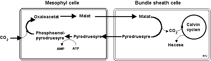 Hatch-Slack reaktionsvejen forekommer i C4-planter for fiksering af carbondioxid. Carbondioxid fikseres først i mesophyl-cellerne som oxaloacetat, der derefter reduceres til malat (eller transamineres til asparaginsyre). Malaten transporteres derefter til en anden type celler (Bundle sheat celler), hvor det decarboxyleres af malat dehydrogenase. Den dannede carbondioxid indtræder i Calvin cyclen og reduceres til hexose. Pyrodruesyre transporteres derefter til mesophylcellerne, for at kompletere Hatch-Slack reaktionsvejen, hvor pyrudruesyren omdannes til oxaloacetat via phosphoenolpyrodruesyre.