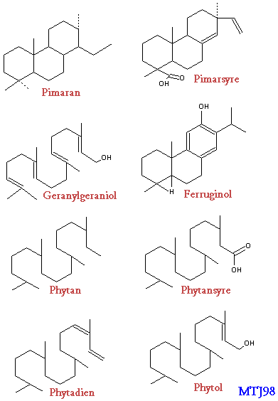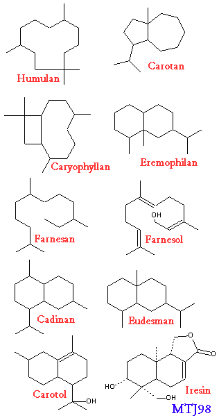 Terpener forekommer vidtspredt i planteriget, de kan have meget forskellige strukturer, men er alle opbygget af isoprenenheder. Hemiterpenerne som kun består af en enkelt isoprenenhed de akkumulerer ikke i planterne men er som regel bundet til andre molekyler ofte en anden terpen. Monoterpener består af kombinationer af to isoprenenheder, sesquiterpenerne af tre isoprenenheder, og di- og triterpenerne af fire og henholdsvis seks isoprenenheder. Polyterpenerne består af molekyler med over 8 isoprenenheder organiseret i en lige kæde. Her kan specielt nævnes phytol der indgår i chlorophylmolekylet.
